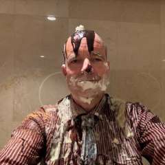 Messy_charlie was surprised by The Great Reinholdo with a big sloppy cream pie to the face